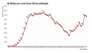 Antes dessa oscilação, as mortes também tiveram um salto na primeira semana do ano, acompanhando a trajetória da curva de casos. Enquanto na semana epidemiológica 53 de 2020 o número de novos óbitos foi de 4.930, na semana epidemiológica 1 de 2021 ele chegou a 6.906. O novo aumento de casos não superou o pico de 2020, de 7.677 novas mortes na semana epidemiológica 30.
