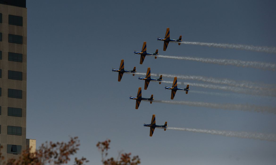 Anunciou-se, então, a chegada daquela que, em todas as apresentações do 7 de setembro, é a que mais agrada ao público: a Esquadrilha da Fumaça – que, a quase 3 mil metros do solo, já chega mostrando a que veio e escreve, no céu sem nuvens do planalto “Ordem e Progresso”. O lema da bandeira desperta, de imediato, os aplausos da plateia.