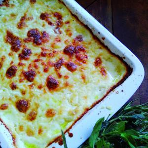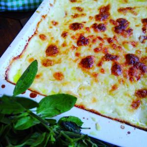 Preaqueça o forno a 220°C (temperatura alta). Com uma colher, espalhe toda a manteiga no fundo de um refratário grande de 26 por 34 centímetros (ou que comporte cerca de três litros) – é uma camada grossa de manteiga mesmo, para dar sabor ao preparo além de untar. Lave, seque e descasque as batatas. Com um fatiador de legumes, corte as batatas em rodelas finas (se preferir, utilize uma faca para fazer fatias com cerca de 0,5 centímetro). Disponha as fatias de batata por todo o fundo do refratário, uma sobreposta à outra (em escama), formando uma camada única – assim todas as batatas cozinham e gratinam por igual no forno. Tempere com uma pitada de sal. Com a lateral da lâmina da faca, amasse e descasque os dentes de alho. Transfira para uma panela pequena (ou fervedor), junte o leite e leve ao fogo médio até começar ferver. Desligue o fogo e tempere com uma colher (chá) de sal, pimenta e noz-moscada a gosto. Descarte os dentes de alho e, com uma concha, regue o leite quente sobre as batatas. Cubra o refratário com papel-alumínio e leve ao forno para assar por cerca de 40 minutos ou até que as batatas estejam macias. Faltando cinco minutos para o tempo das batatas, coloque o creme de leite fresco na mesma panela em que aqueceu o leite (nem precisa lavar). Leve ao fogo médio até começarem a subir as primeiras bolhas. Desligue o fogo. Com cuidado, retire o refratário do forno e descarte o papel-alumínio. Com a concha, regue as batatas com o creme de leite quente. Volte ao forno para assar por mais 30 minutos, até gratinar. Sirva a seguir.