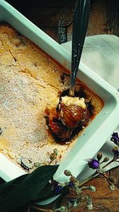 Preaqueça o forno a 190°C. Coloque 50 gramas de açúcar em uma frigideira pequena que possa ir ao forno (de cerca de 18 centímetros de diâmetro), com uma colher sopa de água (se não tiver uma pequena, cozinhe o figo em uma frigideira média comum e transfira depois para uma assadeira quadrada de 22 cenímetros). Leve ao fogo médio-alto por três a quatro minutos, girando a frigideira algumas vezes até o açúcar derreter completamente e borbulhar depressa. Acrescente o vinho e o tomilho com cuidado e mexa sem parar por cerca de um minuto, mantendo a frigideira no fogo até misturar e engrossar. Desligue o fogo, inclua o sumo de limão siciliano e o figo e deixe esfriar por 20 minutos ou mais (só não deve estar pelando quando a cobertura for despejada por cima). Se for necessário, transfira o figo para uma assadeira. Coloque as gemas em uma tigela com as 40 gramas de açúcar restantes, a farinha, o extrato de baunilha, o creme de leite fresco, as raspas de limão siciliano e o sal. Bata até clarear e engrossar (pode ser dois a três minutos à mão ou um minuto na batedeira). Bata a clara em neve separadamente à mão por um a dois minutos e incorpore com cuidado à massa. Espalhe o figo na base da frigideira (ou assadeira) e despeje a massa. Asse por cerca de 30 minutos, até que tenha crescido, esteja dourada e cozida. Tire do forno, divida entre quatro tigelas e sirva quente com sorvete de baunilha ou creme de leite fresco.