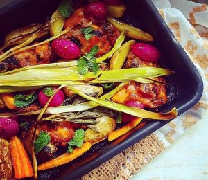 Tempere as coxas e sobrecoxas com a maionese (eu costumo usar maionese caseira), o molho de tomate (também uso caseiro), sal, páprica picante e limão. Coloque em um recipiente, cubra com papel-alumínio e leve ao forno por aproximadamente uma hora e meia. Depois acrescente as batatas. Asse por mais meia hora, mantendo o recipiente coberto por papel-alumínio. Depois, retire o papel-alumínio e acrescente os rabanetes, as cenouras e o alho poró, todos cortados ao meio, e asse por mais cerca de 20 minutos (os legumes se manterão al dente).