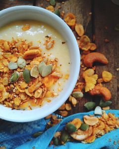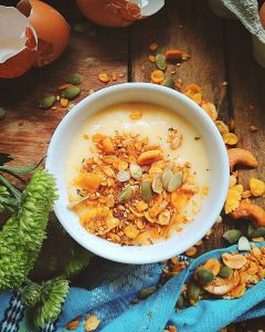 Leve uma panela pequena com água ao fogo médio (ela servirá de base para o banho-maria). Numa tigela, quebre um ovo por vez e transfira para uma tigela média de vidro ou inox (se um não estiver bom, você não perde a receita). Junte o leite, a manteiga e tempere com sal. Encaixe a tigela na panela e mexa com um batedor de arame até engrossar e atingir uma consistência de mingau cremoso. Atenção: os ovos continuam cozinhando e endurecendo com o próprio calor, cuidado para não passar do ponto e cozinhar em excesso (eles podem ressecar). Transfira imediatamente para um prato e finalize com uma pitada de pimenta-do-reino moída na hora. Salpique granola salgada e sirva a seguir.
