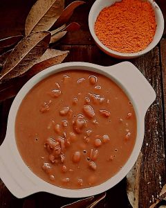 Refogue a cebola, o alho e a páprica defumada. Adicione o feijão, duas folhas de louro e o caldo de limão. Deixe cozinhar por 50 minutos na pressão para apurar os sabores. Corrija o sal e a pimenta do reino, se necessário. Depois, deixe cozinhar até engrossar o caldo (aproximadamente uma hora).