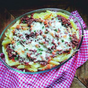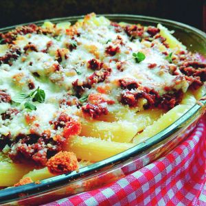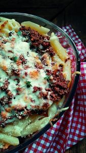 Penne gratinado com carne moída