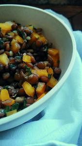 Numa panela média, coloque as lentilhas, cubra com um litro de água e leve ao fogo médio. Quando ferver, abaixe o fogo e deixe cozinhar por cerca de 20 minutos (as lentilhas devem estar cozidas, mas ainda firmes). Enquanto isso, prepare os outros ingredientes. Descasque e corte a cebola em cubos pequenos. Transfira para uma tigela. Numa panela pequena misture o vinagre com o açúcar e a água. Leve ao fogo alto até ferver e o açúcar dissolver, regue ainda quente sobre as cebolas e deixe marinar na geladeira (isso elimina o ardido da cebola). Lave, seque e corte o pimentão ao meio. Descarte as sementes e corte as metades em cubos pequenos. Leve uma frigideira ao fogo médio. Quando aquecer, regue com um fio de azeite, junte o pimentão, tempere com uma pitada de sal e refogue por três minutos, até dourar. Reserve. Assim que estiverem cozidas, passe as lentilhas por uma peneira e deixe escorrer bem a água. Transfira os grãos para uma tigela grande e tempere ainda morno com o caldo de laranja, duas colheres de sopa de azeite, o coentro em pó, sal e pimenta (a lentilha morna absorve melhor os sabores). Escorra a água das cebolas e junte à lentilha temperada. Misture o pimentão e leve à geladeira para esfriar. Na hora de servir, regue com mais azeite. Sirva a seguir.