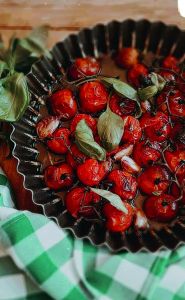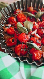 Em um refratário, coloque os tomates higienizados, os dentes de alho e os ramos de tomilho. Regue com o azeite e tempere com o sal, a pimenta e o açúcar mascavo. Asse em fogo baixo (180°C) por duas horas, mexendo de vez em quando.