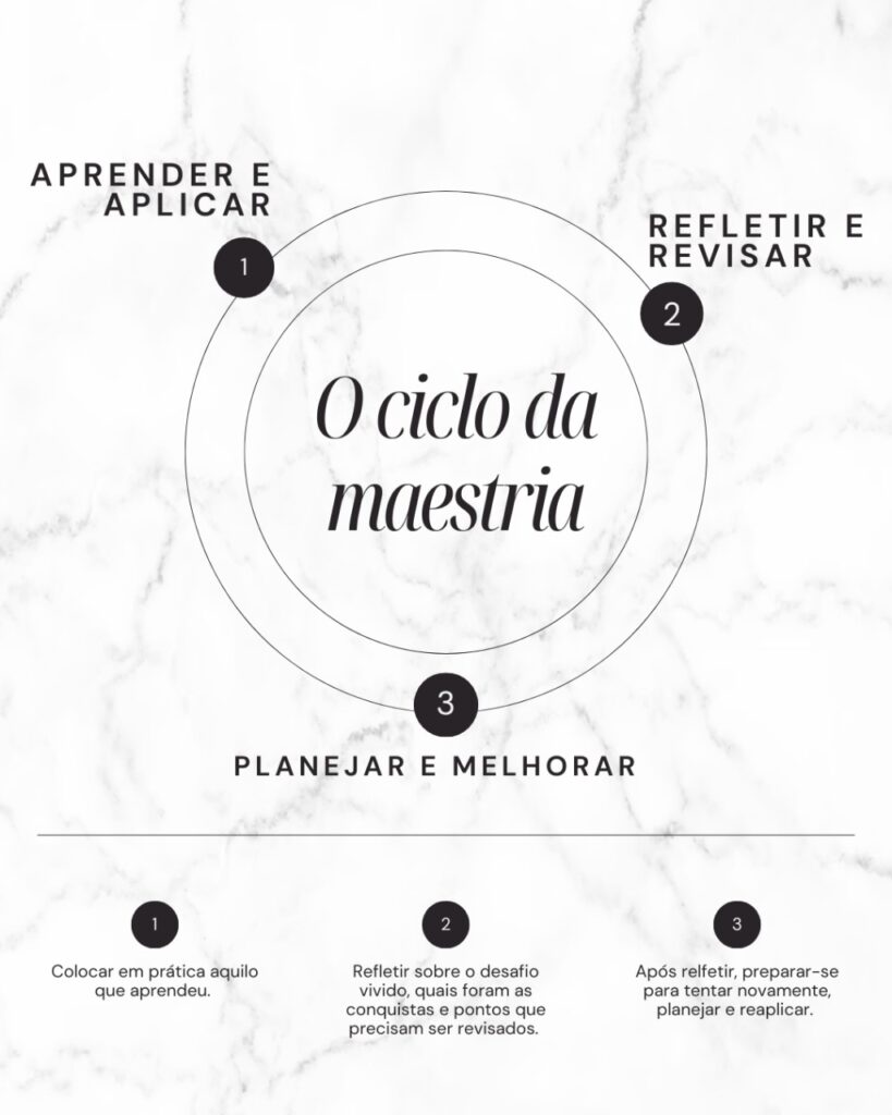 É curioso pensar que quando aliamos estes três fatores do ciclo da maestria, toda e qualquer coisa pode ser uma grande fonte de aprendizado. Não somente falar em público, mas, uma conversa difícil, um desafio ou habilidade nova que você está buscando construir. Até os nossos dias, dos mais difíceis aos mais tranquilos, ao serem analisados e refletidos, podem nos trazer grandes insights para novas possibilidades.