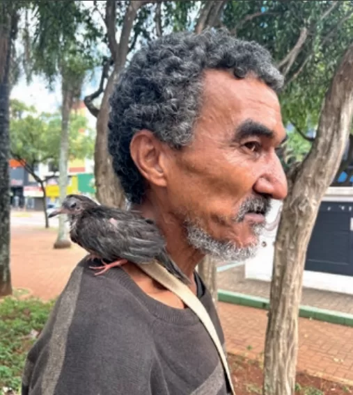 “Eu estava na chuva ali perto daquela imagem da santa na Catedral, quando a pombinha saltou da árvore. Ela caiu na enxurrada. Corri e conseguiu resgatar antes que fosse para a boca de lobo, onde seria devorada por algum rato. Enxuguei a Chuchu na camiseta e fiquei com ela. No dia seguinte procurei o ninho de onde ela caiu para devolver à família, mas não encontrei. Então adotei. Sei que algum dia irá voar e ficarei sem Chuchu”.