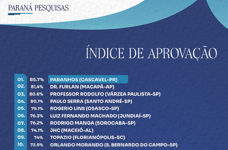 A outra notícia vinha do principal aeroporto regional do Brasil, o de Cascavel, operado pelas três maiores companhias aéreas, e que não para de produzir números superlativos: de pouco mais de 60 mil embarques por ano, o aeroporto vai fechar 2024 com mais de 400 mil passageiros. A terceria notícia vinha do instituto Paraná Pesquisas. Leonaldo Paranhos, de Cascavel, é o prefeito mais bem avaliado do Brasil nas cidades médias e grandes, com quase unânimes 85,7% de aprovação popular.