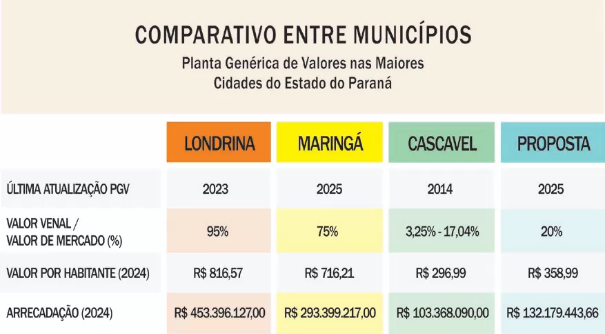 Outros municípios agiram mais rápido. Em Londrina, a atualização da planta já trouxe os imóveis para 95% do valor real de mercado. Lá paga-se R$ 816,00 de IPTU por habitante. Aqui, R$ 296,00. Londrina não é duas vezes maior que Cascavel. Mas arrecada quatro vezes mais IPTU.