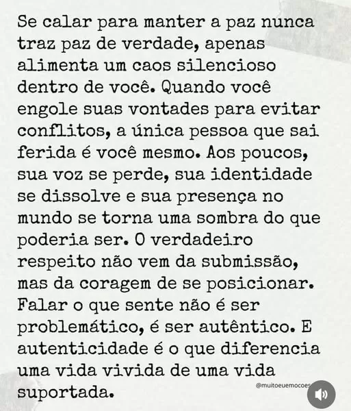 As pessoas vivem em desalinho quando se calam, porque se permitem viver em uma bolha de sofrimento guardando para si todos os sentimentos, engolindo choro e a angústia por medo de se posicionar. Esse comportamento torna o ser humano refém de si, se permitindo perder a própria identidade, vivendo à margem da felicidade.