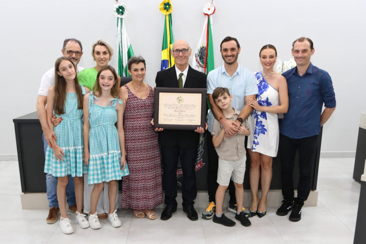 O novo Cidadão Honorário de Marechal Cândido Rondon, Harto Viteck, ladeado pela família: esposa Elenita, genro Gilson Scherer, filha Marla, netas Letícia e Sofia, filhos Cristiano e Alex, nora Daiana e neto Inácio. A entrega da honraria aconteceu na segunda-feira (25), durante sessão solene na Câmara de Vereadores (Foto: Divulgação)O casalo Luiz Carlos e Tatiane Cardozo, ela aniversariou recentemente, parabéns. (Foto: arquivo pessoal)O bonito casal, Cleiton e Sara Cortez que comemoraram 24 anos de feliz união recentemente, tim tim (Foto: arquivo pessoal)A linda Eduarda Van de Sand dando um brilho especial à coluna de hoje (27) (Foto: Arquivo pessoal)O presidente e a vice-presidente eleitos para comandar a subseção da Ordem dos Advogados do Brasil (OAB) de Marechal Cândido Rondon a partir de 2025, Leandro Marcondes e Catia Priesnitz, estiveram no O Presente, ontem (26), para uma entrevista com a jornalista Ana Paula Wilmsen. Clique aqui e confira (Foto: Ellen Noskoski/OP)O querido Paulinho Lang estreia idade nova hoje (27). Felicidades! (Foto: Arquivo pessoal)O casal Lúcia e Milvo Missio comemora hoje (27) o aniversário dela. Tim-tim! (Foto: Arquivo pessoal)Quem apaga velinhas hoje (27) é a Claudete Joana Trento. Feliz aniversário! (Foto: Arquivo pessoal)Cleide Mombach, aniversariante de hoje (27). Parabéns! (Foto: Arquivo pessoal)O presidente da Associação Comercial de Nova Santa Rosa (Acinsar), Kassio Rusch, esteve no O Presente, na segunda-feira (25), para participar do Play, o programa que liga você à informação. Ele foi reeleito para comandar a entidade por mais uma gestão. Clique aqui e confira a entrevista (Foto: Dean Lopes/OP)