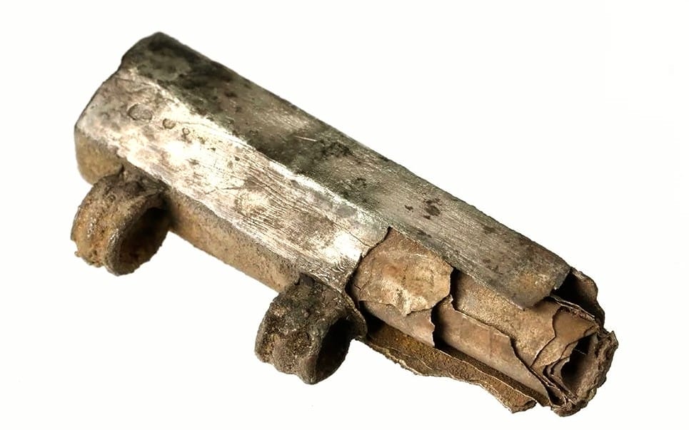 O minúsculo artefato, que mede pouco mais de três centímetros, já havia sido descoberto em 2018, em uma sepultura romana do século III, nas proximidades de Frankfurt. Os arqueólogos o encontraram no esqueleto de um homem enterrado em um cemitério na cidade romana de Nida, um dos mais relevantes sítios arqueológicos do estado de Hesse. Encontrado sob o queixo do esqueleto, o objeto de assemelha a um filactério (invólucro que acomoda um minúsculo pergaminho com texto bíblico utilizado em rituais judaicos preso a testa e aos braços). O objeto era provavelmente utilizado como pendente ao redor do pescoço para fornecer proteção espiritual.