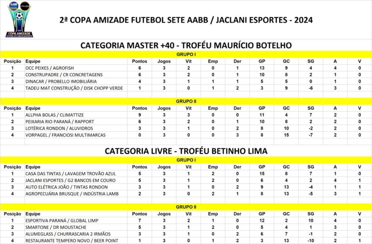 Foi encerrada nesta quinta-feira (11) com a realização de três jogos, a 1ª fase da 2ª Copa Amizade de Futebol Sete AABB/Jaclani Esportes, competição organizada pela Associação Atlética Banco do Brasil de Marechal Rondon.