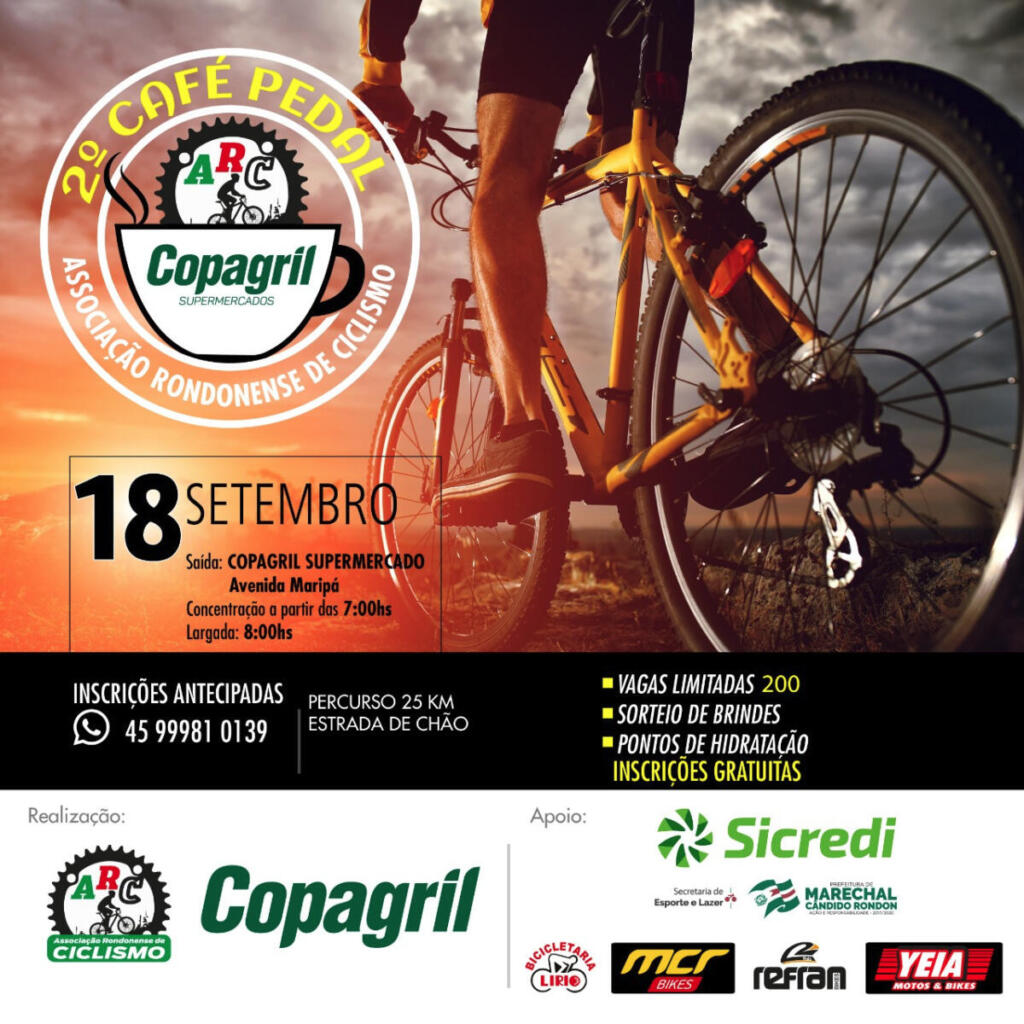 A Associação Rondonense de Ciclismo (ARC) e os Supermercados Copagril realizam neste domingo (18) o 2º Café Pedal. O evento tem apoio da Secretaria Municipal de Esporte e Lazer, do Sicredi, Bicicletaria Lirio, MCR Bikes, Refran Bikes e Yeia Motos & Bikes.