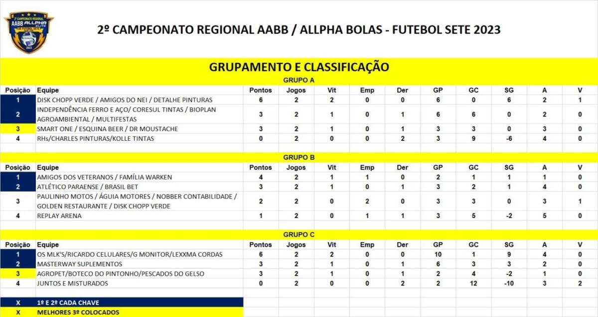 Já pelo Grupo B, as quatro equipes chegarão com condições de avançar na última rodada. Com gol de Bolha, o Amigos dos Veteranos/ Família Warken Bolha venceu o Atlético Paraense/ Brasil Bet por 1 a 0 e lidera a chave com quatro pontos.