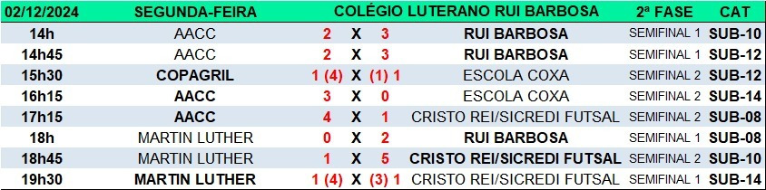 O destaque foi o Colégio Rui Barbosa, que emplacou três equipes na final. A AACC também teve bom desempenho a garantiu dois times na decisão. Colégio Cristo Rei, Colégio Martin Luther e Copagril completam a lista dos classificados para as decisões.