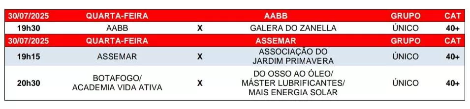 Já no campo da Assemar, o Botafogo/Academia Vida Ativa chegou a quatro pontos, na 3ª colocação, ao vencer a Assemar por 4 a 1, com gols de Paulinho Kuhn, três vezes, e Amarelinho (Sidnei descontou).