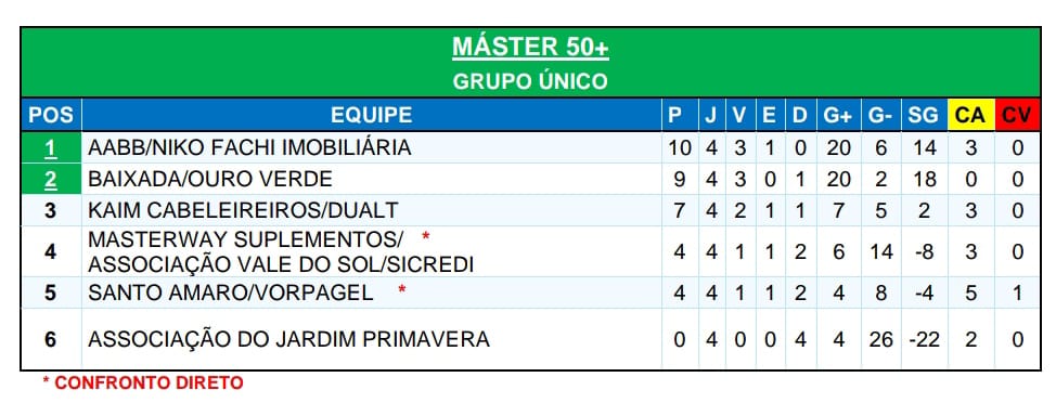 No fechamento da rodada, a Masterway Suplementos/Associação Vale do Sol/Sicredi, com dois gols de Ivo Lodi, venceu o Santo Amaro/Vorpagel, que marcou com Vandir, por 2 a 1, e assumiu a 4ª colocação.