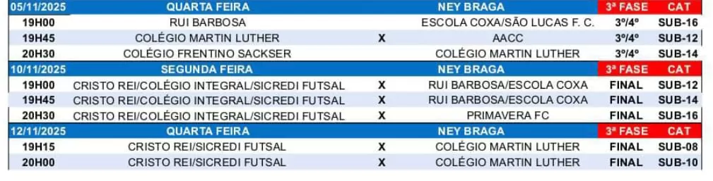 Em seguida, o Rui Barbosa/Escola Coxa, com gols da dupla dinâmica Bea, duas vezes, e Quinzinho, venceu a AACC, que descontou com Igor, por 3 a 1, e ficou com o bronze na categoria sub-10.