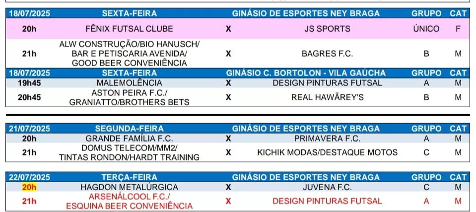 Nesta sexta-feira (18) mais quatro jogos serão disputados pelo Municipal, que terá sua 1ª fase encerrada nos dias 21 e 22 de julho. Confira a programação das últimas rodadas classificatórias: