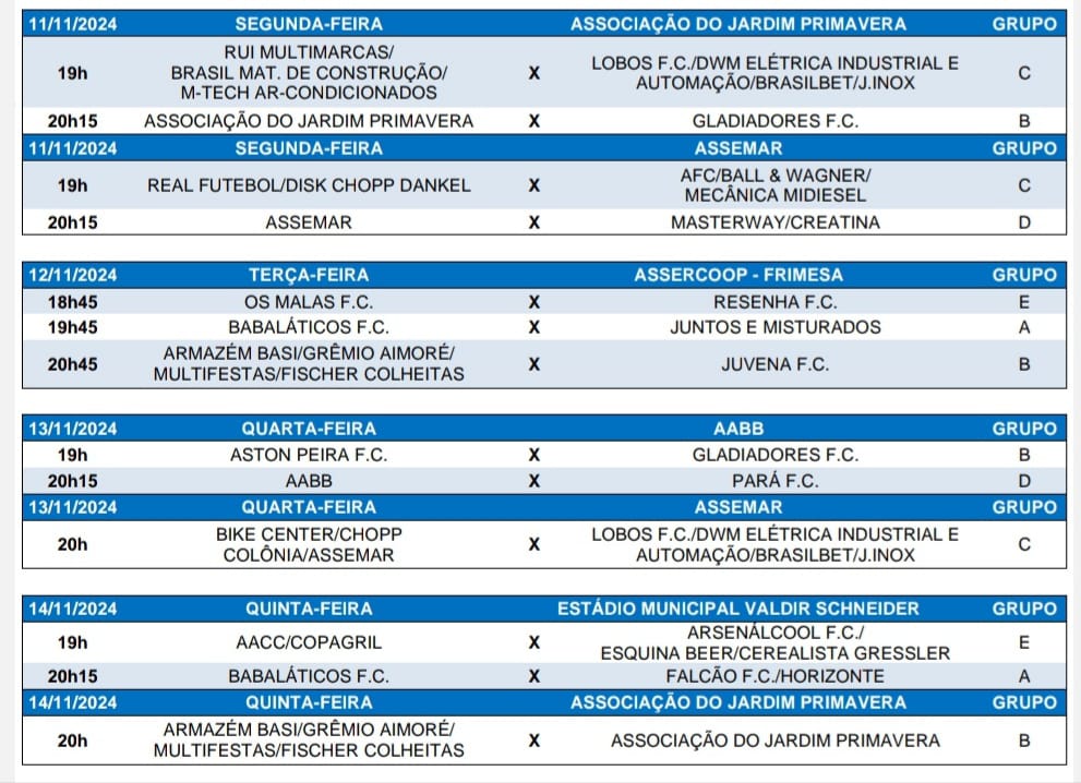 Em seguida, a Hardt Training/G7 Barber Club/Abramix, com gols de Jhonatan, Rafinha Muller, João Perachi e Edir Warken, venceu o Rui Multimarcas/Brasil Mat. de Construção/M-Tech Ar-Condicionado, que marcou com William, Amarelão e Ivan, por 4 a 3, e fechou sua participação no Grupo C com 13 pontos, também garantido no mata-mata.