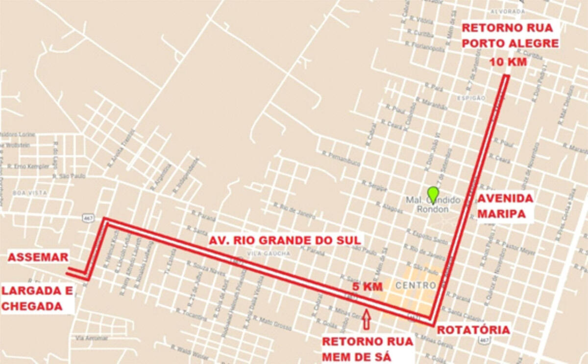 A largada e a chegada serão na sede da Assemar passando pelas avenidas Rio Grande do Sul (trajeto de 5km) e Maripá (10km)