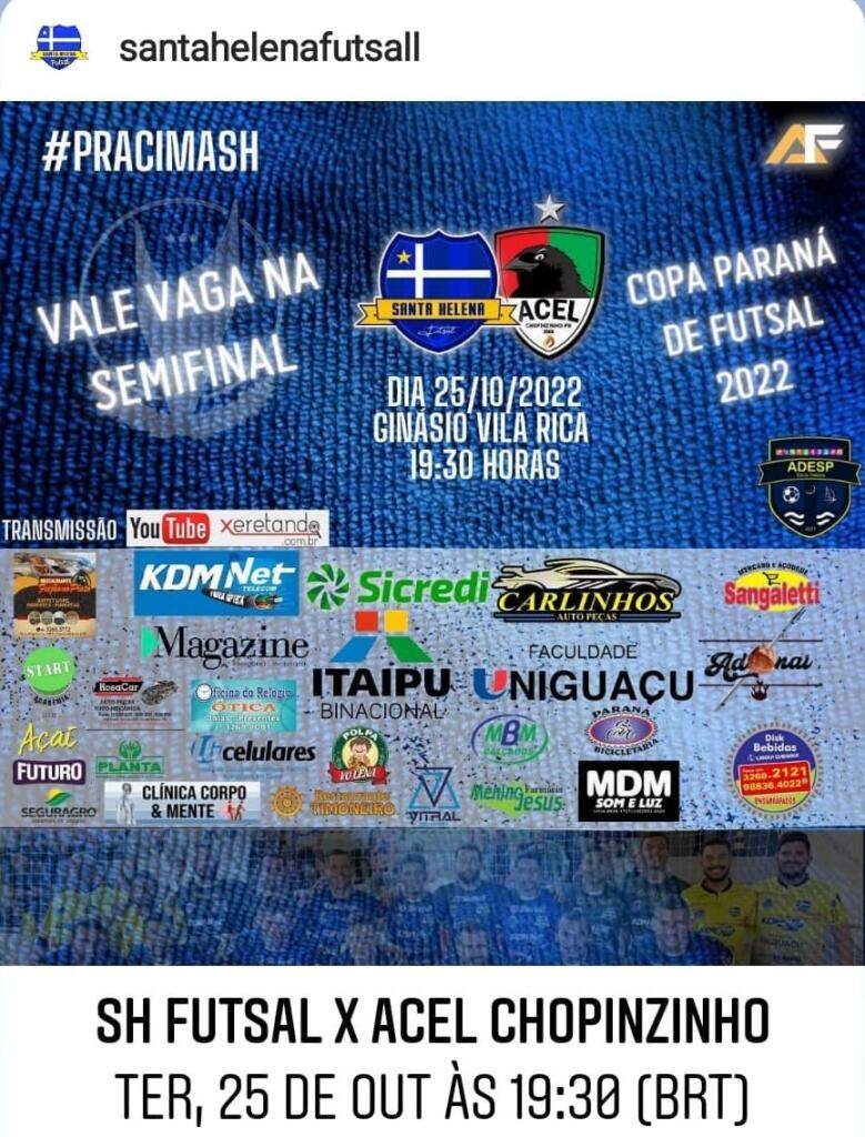 No primeiro jogo, o Santa Helena Futsal venceu por 1×0. A partida de volta será realizada no Ginásio de Esportes da Vila Rica, às 19h30 desta terça-feira (25). Os ingressos serão vendidos apenas no local e custam R$ 10 reais.