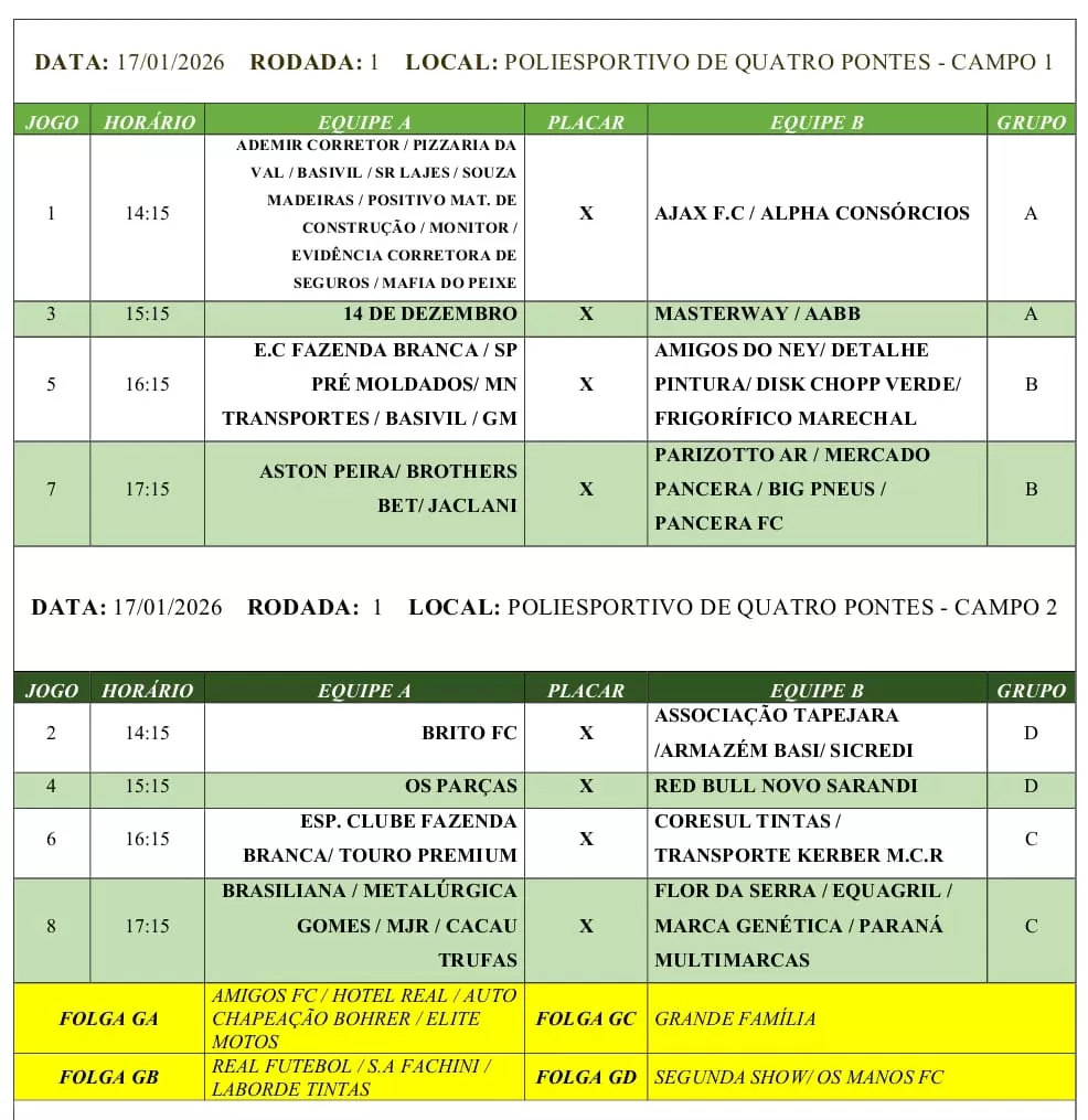 Dentre os destaques da 1ª rodada, o duelo entre Ajax FC/Alpha Consórcios, principal equipe de Quatro Pontes no torneio, sempre cotado como favorito ao título, e Máfia de Peixe, de Novo Sarandi. O duelo abre a 8ª edição, às 14h15, no campo 1.