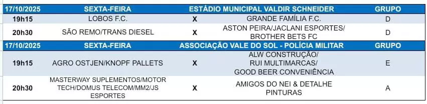 O Campeonato Municipal de Futebol Suíço Livre 2025, organizado pela Secretaria de Esportes e Lazer de Marechal Rondon, terá sequência nesta sexta-feira (17) com quatro partidas, nos campos da Associação Vale do Sol (Polícia Militar) e estádio Valdir Schneider.