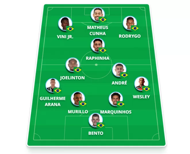 Provável escalação: Bento, Wesley, Marquinhos, Murillo e Guilherme Arana; André, Joelinton e Raphinha; Vini, Rodrygo e Matheus Cunha.