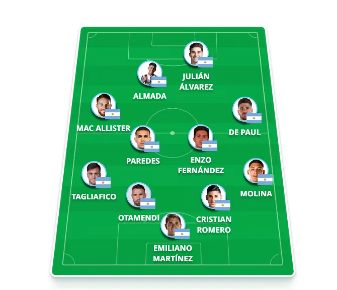 Provável escalação: Dibu Martínez; Molina, Romero, Otamendi e Tagliafico; Rodrigo De Paul, Leandro Paredes, Enzo Fernández, Alexis Mac Allister; Thiago Almada e Julián Álvarez.