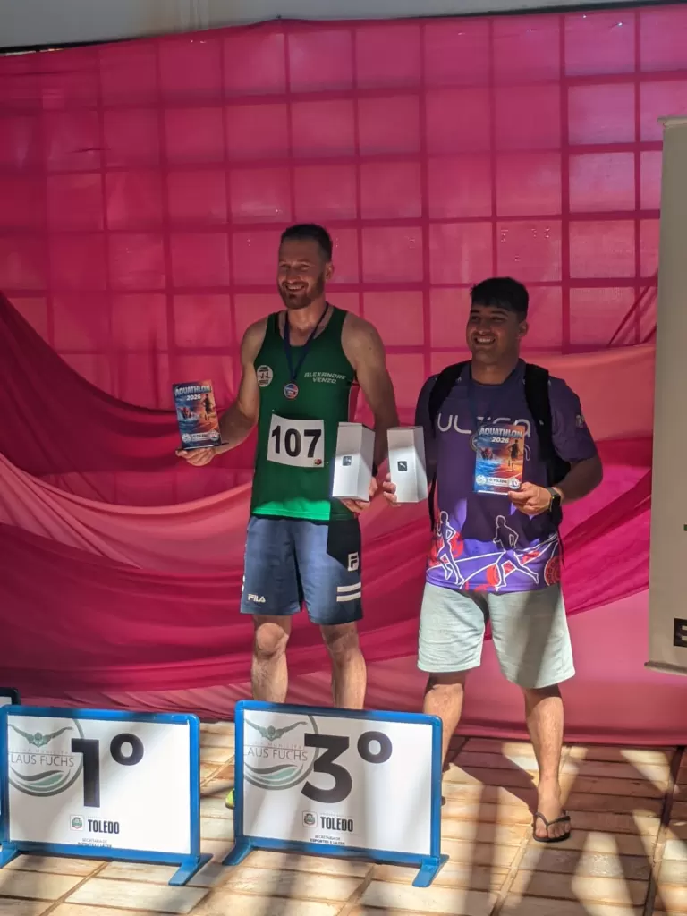 Ainda no domingo, outros atletas marcaram presença no Aquatlon 2026, promovido pela Secretaria de Esportes de Toledo. A competição foi realizada em formato de revezamento em duplas, envolvendo corrida e natação. Alexandre Venso (corrida) e Gustavo de Aquino Rodrigues (natação) conquistaram o 3º lugar. Já Murilo Cardoso (corrida) e Daniel Marcelo Herzog (natação) ficaram com a 4ª colocação. Pedro Emanuel Moreira Machado competiu na categoria individual. Ao todo, os participantes enfrentaram 400 metros de natação e 3.200 metros de corrida.