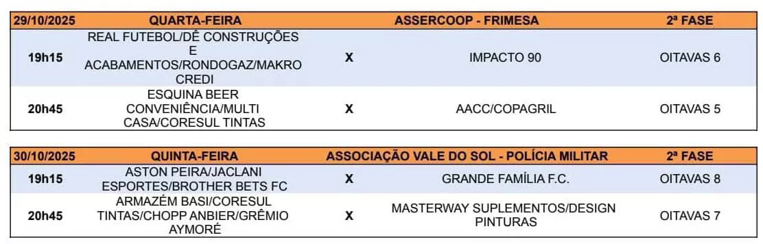 Teve sequência nesta quarta-feira (28), com dois jogos na Assercoop/Frimesa, a fase oitavas de final do Campeonato Municipal de Futebol Suíço Livre 2025, organizado pela Secretaria de Esportes e Lazer de Marechal Rondon.