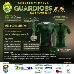 O Batalhão de Polícia de Fronteira da Polícia Militar do Paraná (BPFron) está promovendo a segunda edição do evento virtual Guardiões da Fronteira, com o objetivo de beneficiar pessoas e entidades carentes que foram afetadas pela pandemia Covid-19 e que necessitam de alimentos.