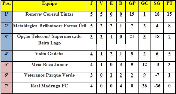 No primeiro duelo da tarde, a Renove/Coresul Tintas manteve o 100% de aproveitamento ao vencer a Volta Gaúcha por 1 a 0, com gol assinalado por Clevinho, convertendo pênalti sofrido por Lucas aos 36’ da primeira etapa.