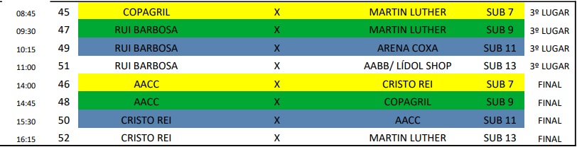 No período da manhã, serão disputadas as partidas que irão apontar os terceiros colocados de cada categoria, a partir das 8h45. À tarde, a partir das 14h, acontecem as grandes finais.