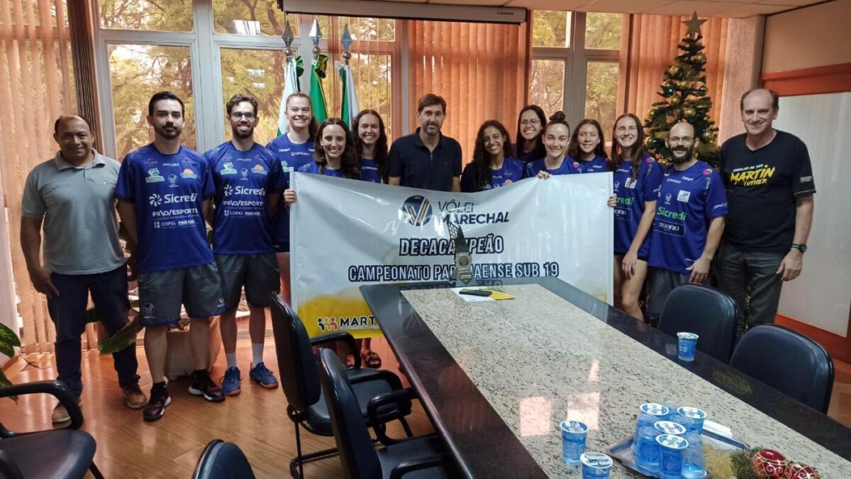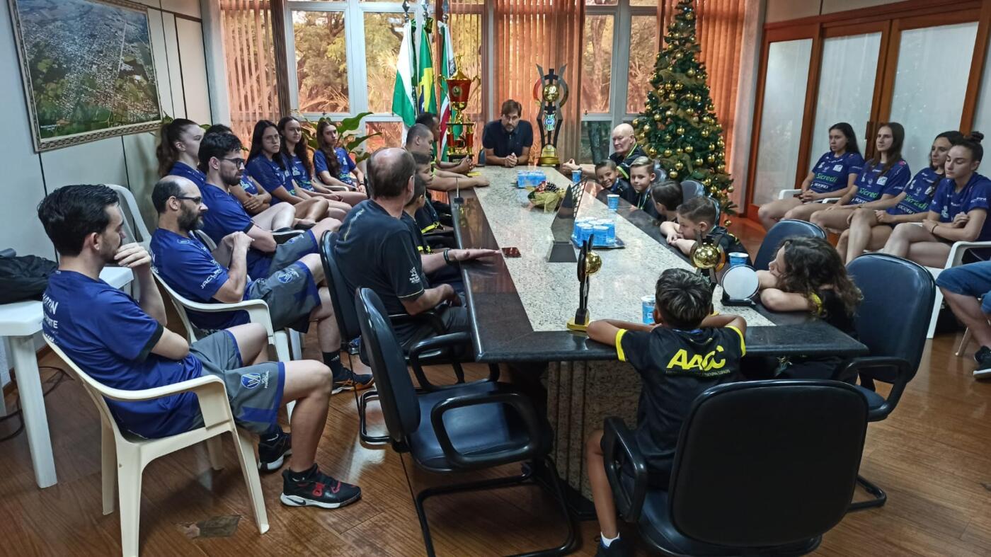 Os atletas de futsal sub-8 e de voleibol sub-19 de Marechal Cândido Rondon que sagraram-se campeões paranaenses, foram recepcionados pelo prefeito Marcio Rauber, nesta tarde de quinta-feira (21), na sala de reuniões do gabinete.