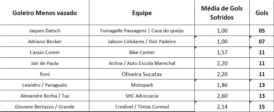 Quem “pegou” mais foi Adriano Becker, goleiro do Jakson Celulares/Iloir Padeiro, com sete gols sofridos. Como 2º goleiro menos vazado ficou Jaques Datsch, da Fumagalle Passagens/Casa do Queijo, com cinco gols sofridos e um jogo a menos que o vencedor.