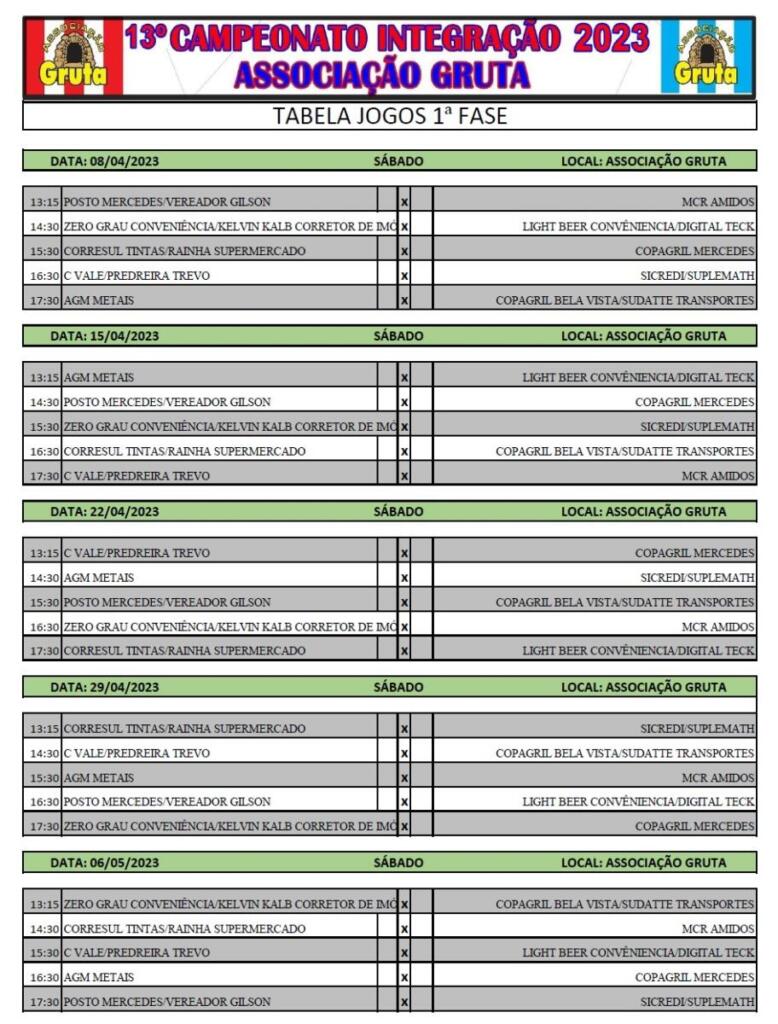 O campeonato será disputado sempre nas tardes de sábado, no campo da Associação Gruta. A final está prevista para o dia 28 de maio, com almoço promovido pela comunidade.