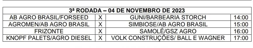 Na sequência, a Simbiose/AB Agro Brasil, com gols de Jeffão e Vitinho, derrotou a Knopf Palets/Agro Diesel por 2 a 0 e também manteve o 100% de aproveitamento no torneio.