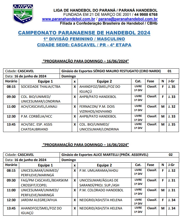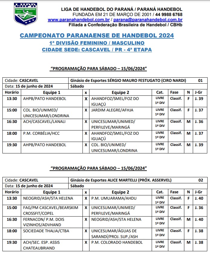Com cada participante jogando duas vezes no fim de semana, ao todo serão vintes jogos para o público acompanhar. Lembrando que não há cobrança de ingresso para assistir as disputas. Dois jogos são imperdíveis e acontecem neste sábado (15). Cascavel e Maringá, o maior clássico do handebol paranaense na atualidade, se enfrentam tanto no masculino quanto no feminino.
