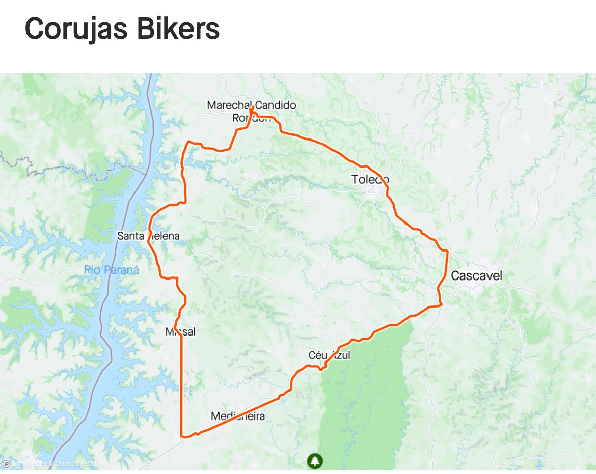 A saída está marcada para a meia-noite de quarta para quinta-feira. De Marechal Cândido Rondon o Corujas Bikers segue para Pato Bragado, Entre Rios do Oeste, Santa Helena, Missal, Itaipulândia, São Miguel do Iguaçu, Medianeira, Matelândia, Céu Azul, Santa Tereza do Oeste, Cascavel, Toledo e Quatro Pontes.