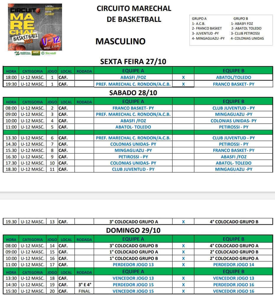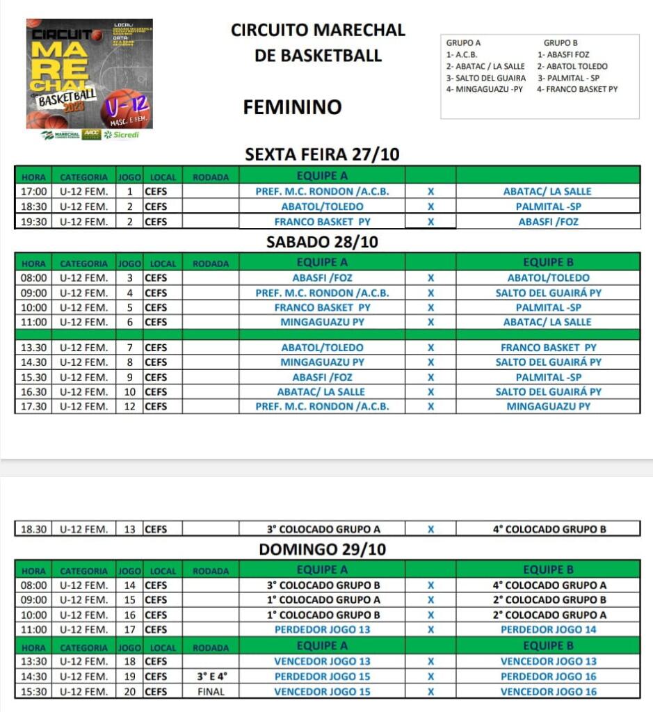 A programação do Circuito Marechal sub-12 começa nesta sexta-feira, a partir das 17 horas no Feminino, e 18 horas no Masculino. As decisões estão programadas para domingo à tarde.