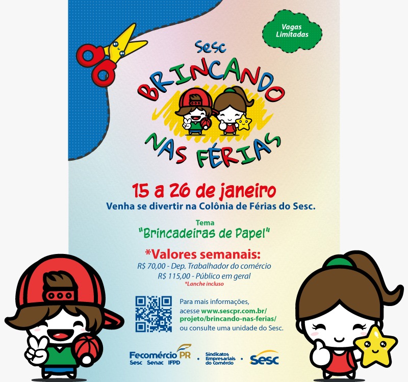 Terá início na próxima segunda-feira (15) mais uma edição da tradicional Colônia de Férias do Sesc Marechal. Durante duas semanas, crianças de 4 a 12 anos irão participar de diversas atividades lúdicas, dentre elas o Cinesesc, brinquedos infláveis, oficinas diversas e muito mais.