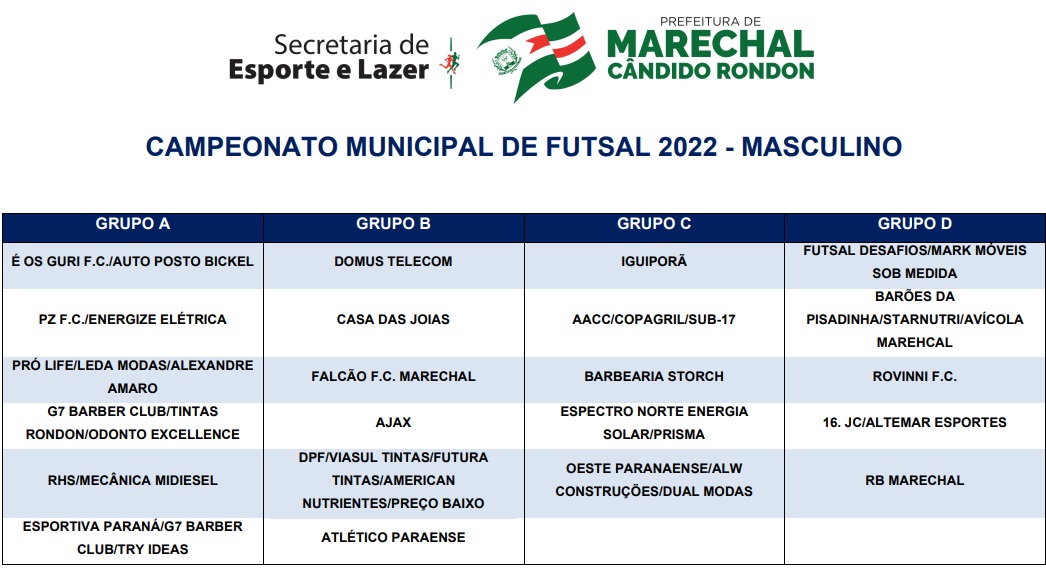 Foram definidas na noite de ontem (04), em congresso técnico realizado na Secretaria Municipal de Esporte e Lazer (SMEL) de Marechal Cândido Rondon, as fórmulas de disputa do Campeonato Municipal de Futsal 2022, promovido pela SMEL, que terá seu início no próximo dia 12, com a tabela ainda a ser divulgada pela organização.