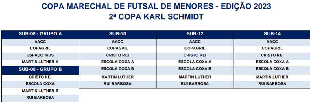 Neste ano, 29 equipes vão disputar o torneio, nas categorias sub-8, sub-10, sub-12 e sub-14, representando a AACC/Copagril, Escola Coxa, Colégio Cristo Reu, Colégio Martin Luther, Colégio Martin Luther e Espaço Kids.