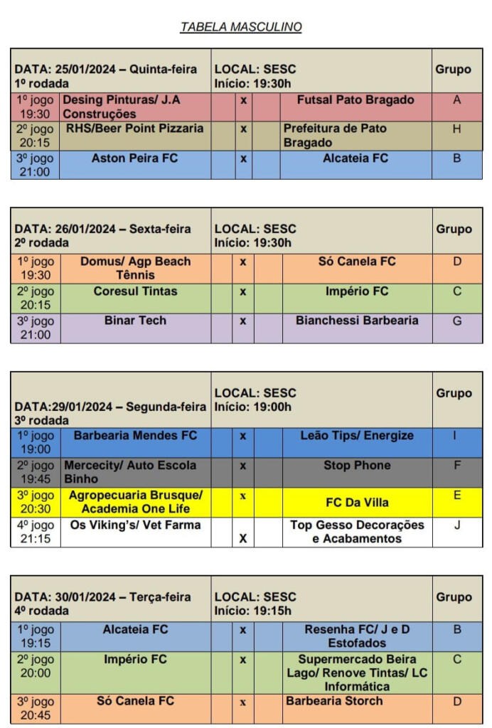 Grupo E: Hagdon Metalúrgica/Laborde Tintas/Ordetech, Agropecuária Brusque/Academia One Life e FC da Villa