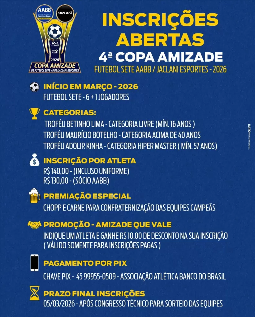 Mais informações com a secretaria de AABB, através do fone/WhatsApp (45) 99955-0509, e com o diretor esportivo Maicon Krein, pelo WhatsApp (45) 99947-4579.