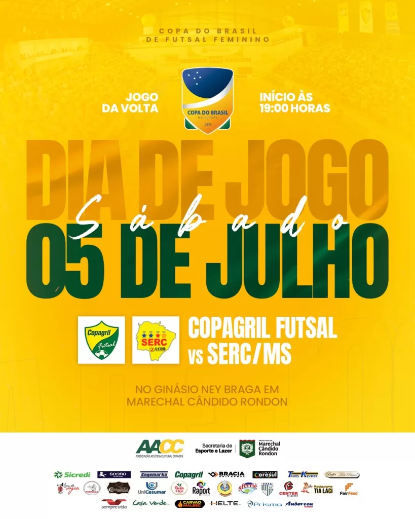 Jogo decisivo para a AACC Copagril/Prefeitura de Marechal Rondon. Neste sábado (5), às 19 horas, no ginásio Ney Braga, a equipe rondonense recebe a SERC UCDB, Campo Grande (MS), no confronto de volta da 1ª fase da Copa do Brasil de Futsal Feminino, organizada pela CBFS.